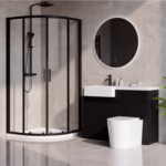 This bathroom suite includes: 900mm Black Quadrant Shower Enclosure with Tray & Waste, Black Light- Hand Toilet & Sink Unit with Back to Wall Toilet & Soft Close Seat and Semi-Recessed Basin with Waste.