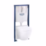 Matt White Wall Hung Rimless Toilet with Soft Close Seat Grohe Cistern Frame and Chrome Flush – Verona